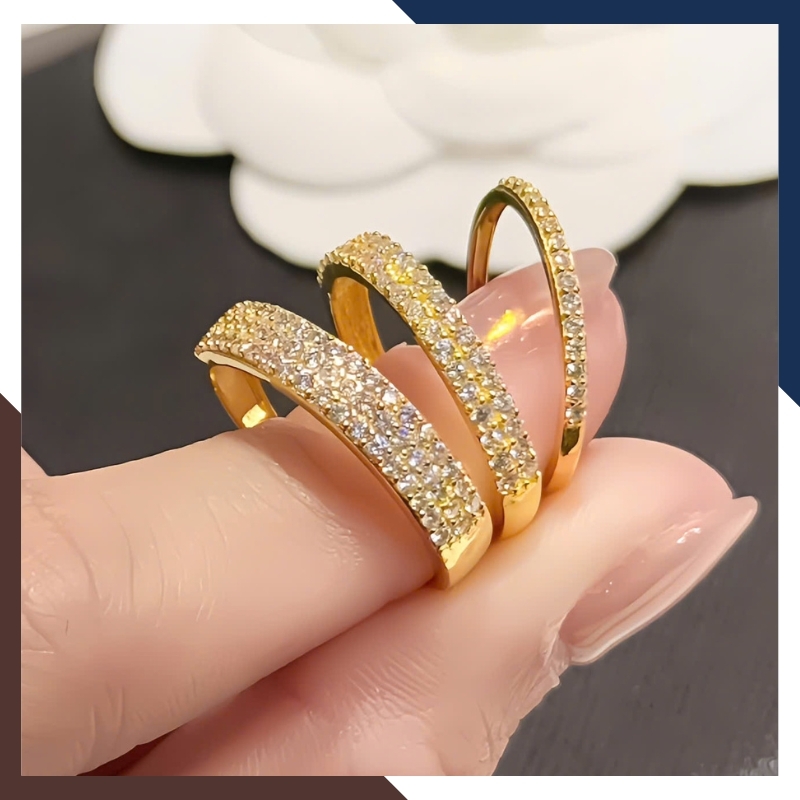 Nếu muốn tạo điểm nhấn mạnh mẽ và khẳng định phong cách cá nhân, bạn sẽ yêu phiên bản 3 hàng đá. Các viên CZ phủ kín bề mặt nhẫn, ánh sáng tỏa ra từ nhiều hướng, mang đến vẻ sang trọng đậm chất quý phái.