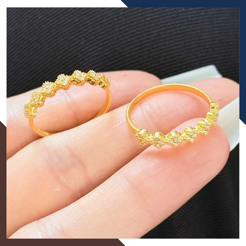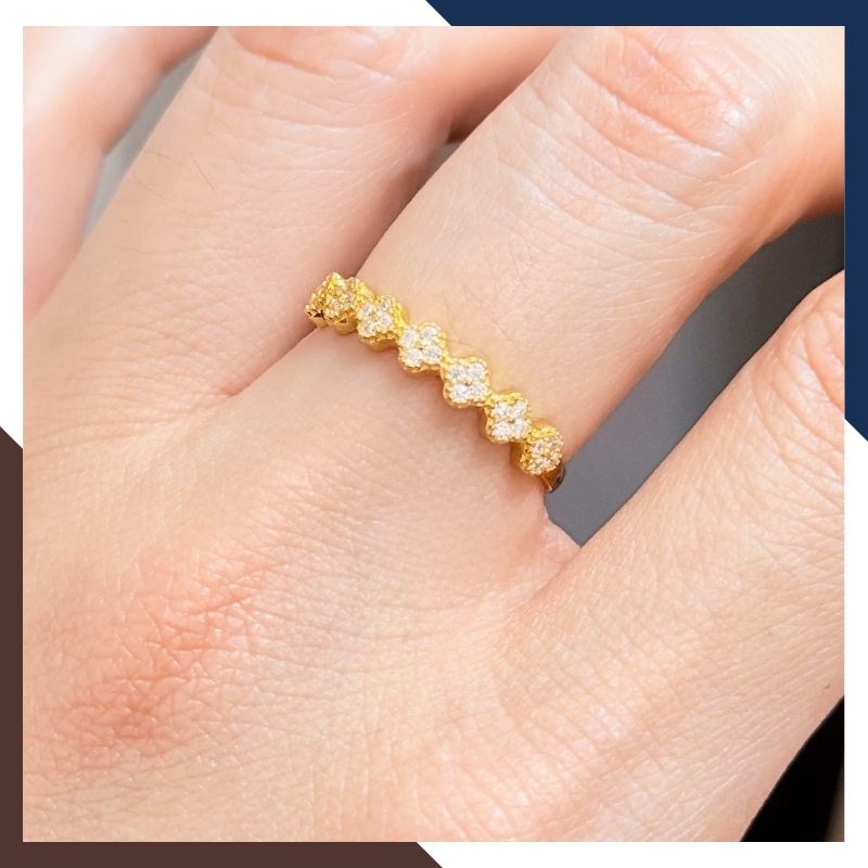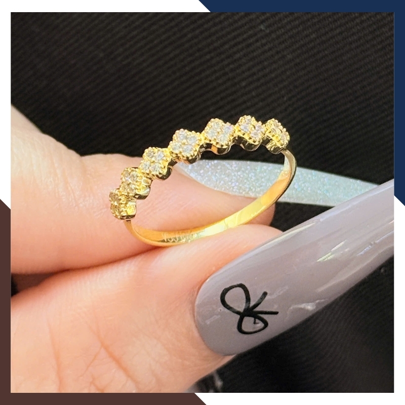 → Đây là nhẫn vàng 10k bản mảnh, mặt nhẫn gắn đá CZ tạo hình cỏ 4 lá – biểu tượng may mắn và sang trọng. -