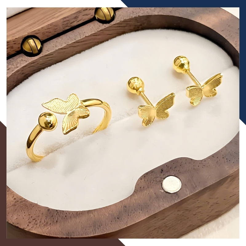 Điểm nhấn đặc biệt của sản phẩm chính là hình bướm 3D điệu đà, được khắc vân nổi tinh xảo. Một bên là cánh bướm, một bên là viên cầu vàng sáng bóng – tất cả tạo nên sự cân bằng giữa nữ tính và hiện đại.