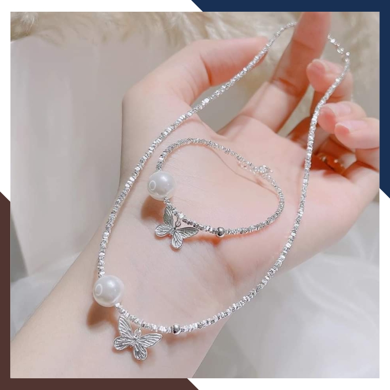 Kiểu dáng: Sét dây chuyền và lắc tay ngọc trai mix vụn bạc và charm bướm bạc