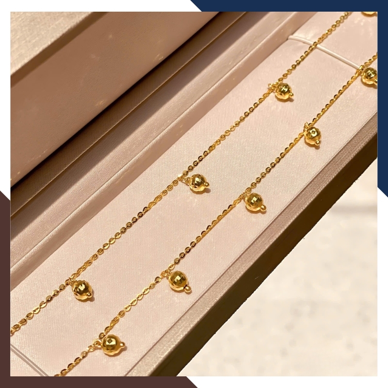 Các chuông được phân bố cân đối, không quá dày cũng không quá thưa, mang lại cảm giác nhịp điệu mềm mại. Khi kết hợp cùng dây vàng mảnh, tổng thể set lắc mang nét nữ tính – uyển chuyển – duyên dáng, đúng tinh thần của các set trang sức vàng thanh lịch.