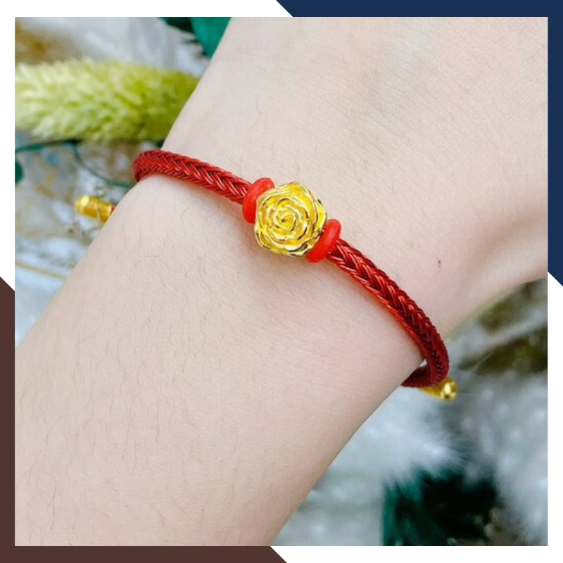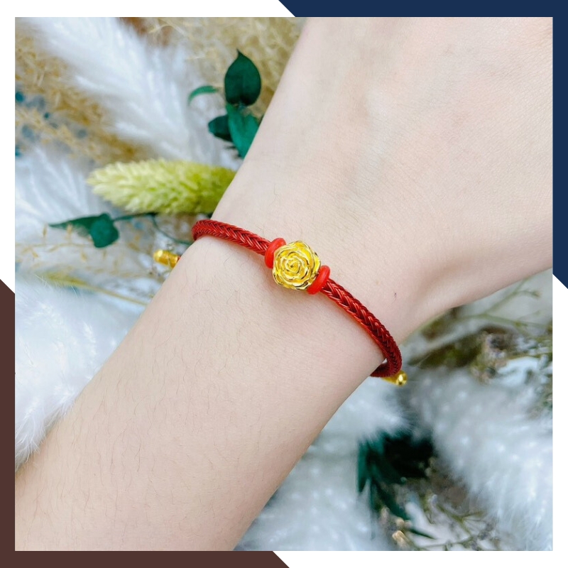 Vòng tay charm vàng 24k ( vàng ta 9999 ) hình hoa hồng cho nữ đẹp mã TL1C5, điểm nhấn của mẫu vòng tay này chính là charm hình bông hoa hồng bằng vàng 24k ( vàng ta 9999 ) - là loại vàng nguyên chất có độ tinh khiết 99.99%, với đặc tính không gây kích ứng cho da, đảm bảo độ bền và độ sáng bóng theo thời gian, Charm được đúc đặc có trọng lượng 1 chỉ 5 phân vàng ta 9999 đảm bảo dày dặn không bị móp méo trong quá trình sử dụng. Khi kết hợp charm hoa hồng vàng 24k ( vàng ta 9999 ) với vòng dây dây cáp đỏ có đặc tính không thấm nước, bền chắc vừa đảm bảo an toàn cho charm vàng không bị rơi tuột trong quá trình sử dụng mà màu đỏ còn đem lại may mắn cho người đeo. Với tính năng chống nước và độ bền cao, sản phẩm này được yêu thích bởi những người cá tính ưa thích sự năng động, có thể yên tâm khi dùng sản phẩm này trong những hoạt động ngoài trời, hay chơi thể thao...Mẫu vòng tay này không chỉ tạo nên một vẻ ngoài sang trọng, cuốn hút cho phái đẹp mà còn tạo cảm giác thoải mái khi đeo và dễ dàng kết hợp với nhiều loại trang phục khác nhau, từ trang phục hàng ngày, trang phục dạo phố cho đến trang phục công sở hay trang phục dự tiệc. Khi đeo chiếc vòng tay này sẽ mang lại một vẻ đẹp nhẹ nhàng, thanh lịch và không gian cho những cô nàng có phong cách đằm thắm tỏa ra một năng lượng tích cực và lãng mạn , thu hút mọi ánh nhìn xung quanh.