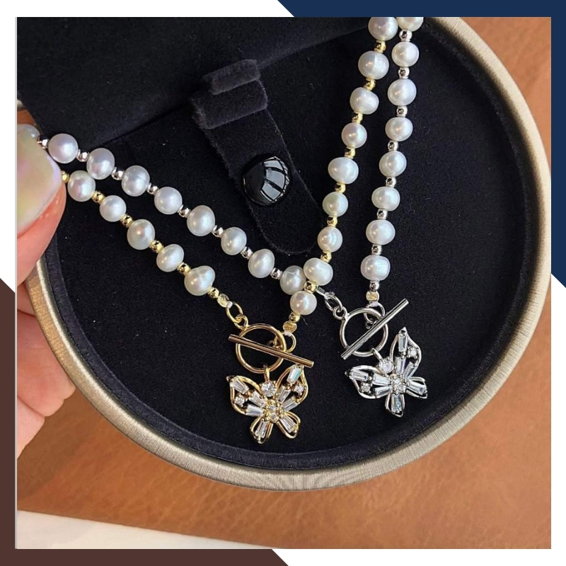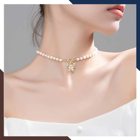 Kiểu dáng: Vòng cổ ngọc trai dáng choker mix bi và khóa kình con bướm bằng bạc xi kim hoặc mạ vàng