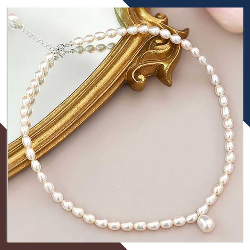 Kiểu dáng: Vòng cổ ngọc trai tự nhiên dáng hạt gạo 8-9mm có mặt ngọc trai to 10x13mm