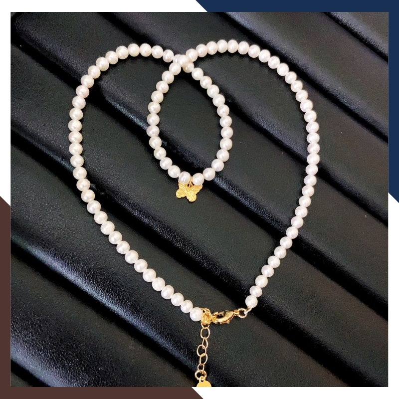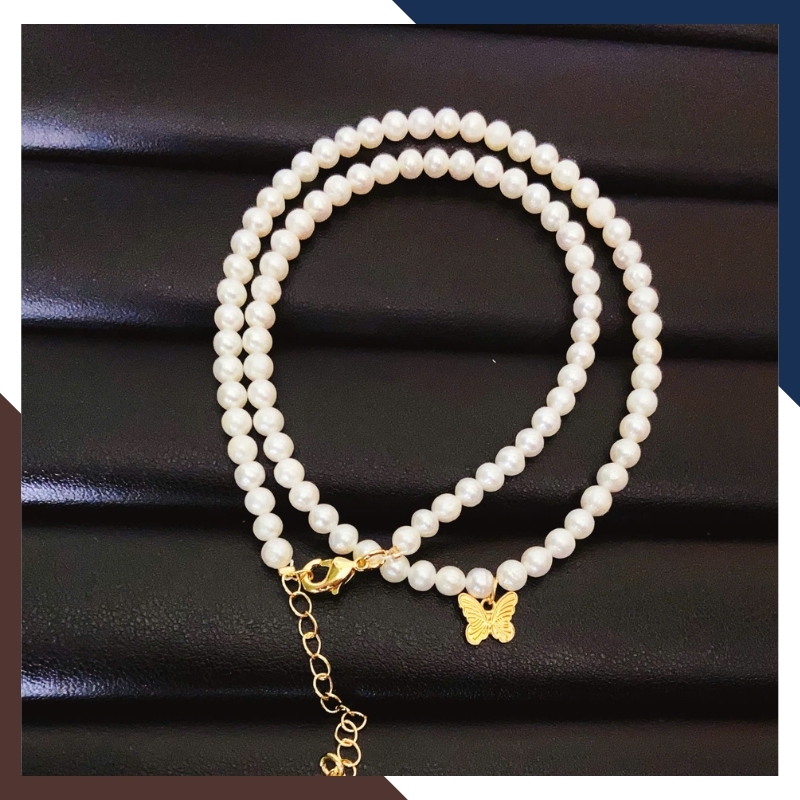→ Là mẫu vòng cổ ngọc trai hạt nhỏ (3–4mm) dáng choker, phối charm bướm vàng 10k sang trọng.