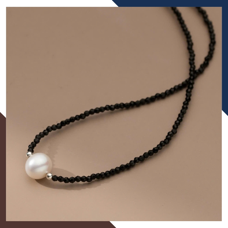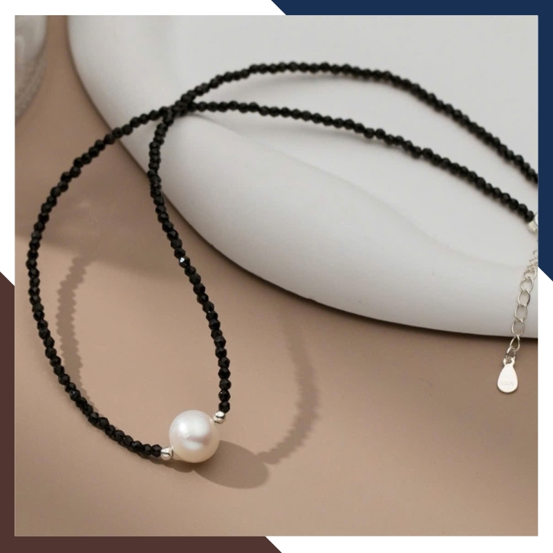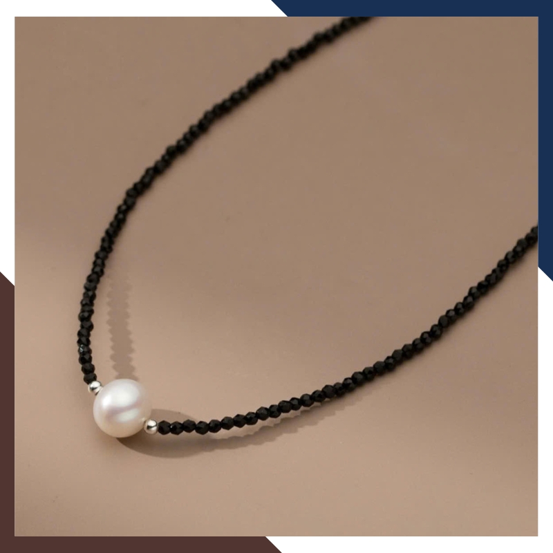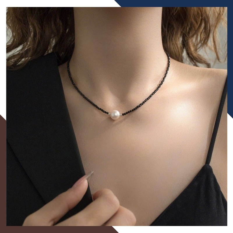 Kiểu dáng: Vòng cổ pha lê đen cao cấp dáng choker đính mặt ngọc trai trắng 10-11mm