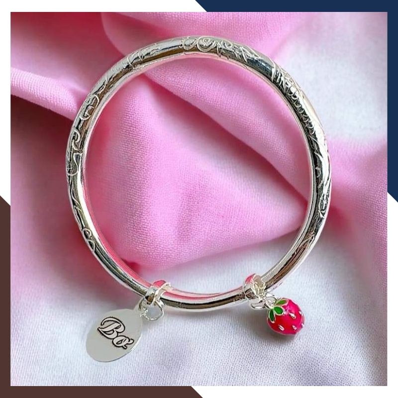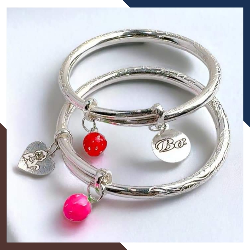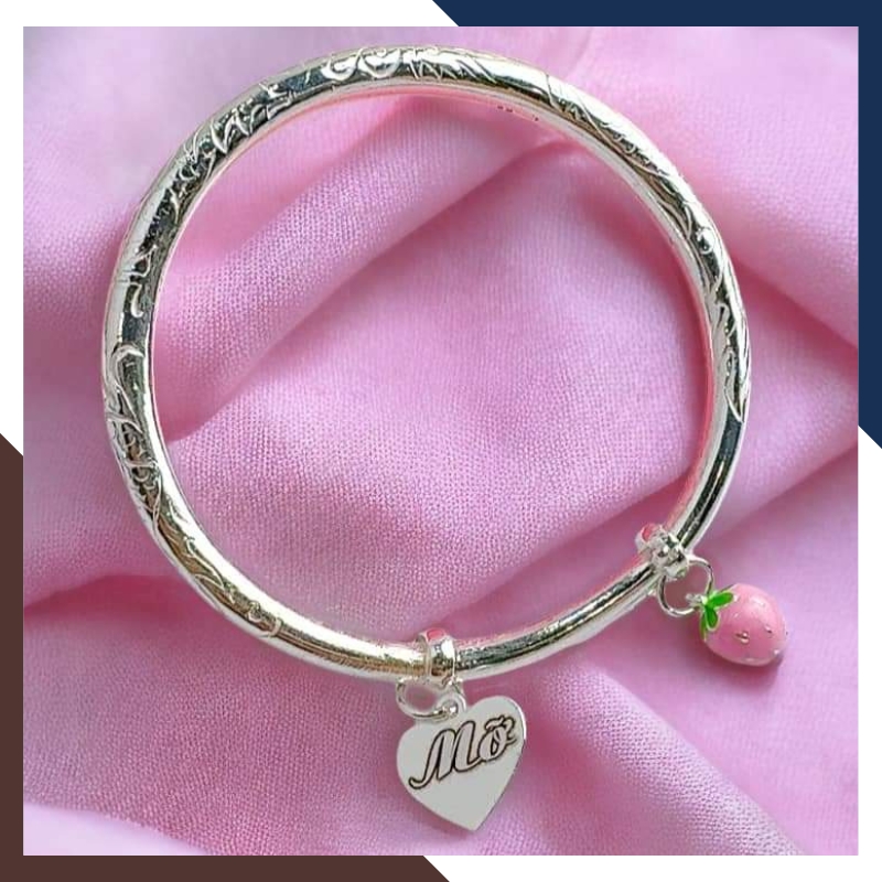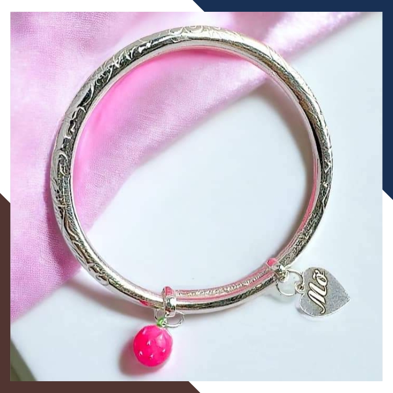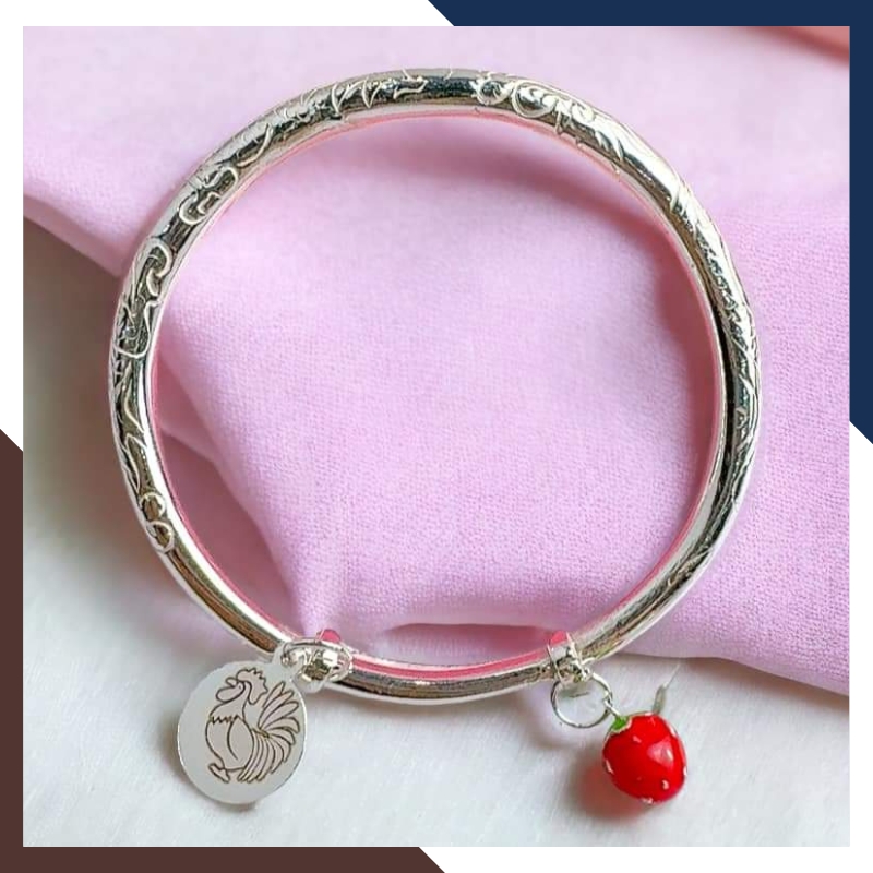 Kiểu dáng: Vòng tay bạc cho bé dạng kiềng khắc tên, con giáp theo tuổi của bé và mix quả dâu tây sơn đỏ - phù hợp đeo cho cả be trai và bé gái
