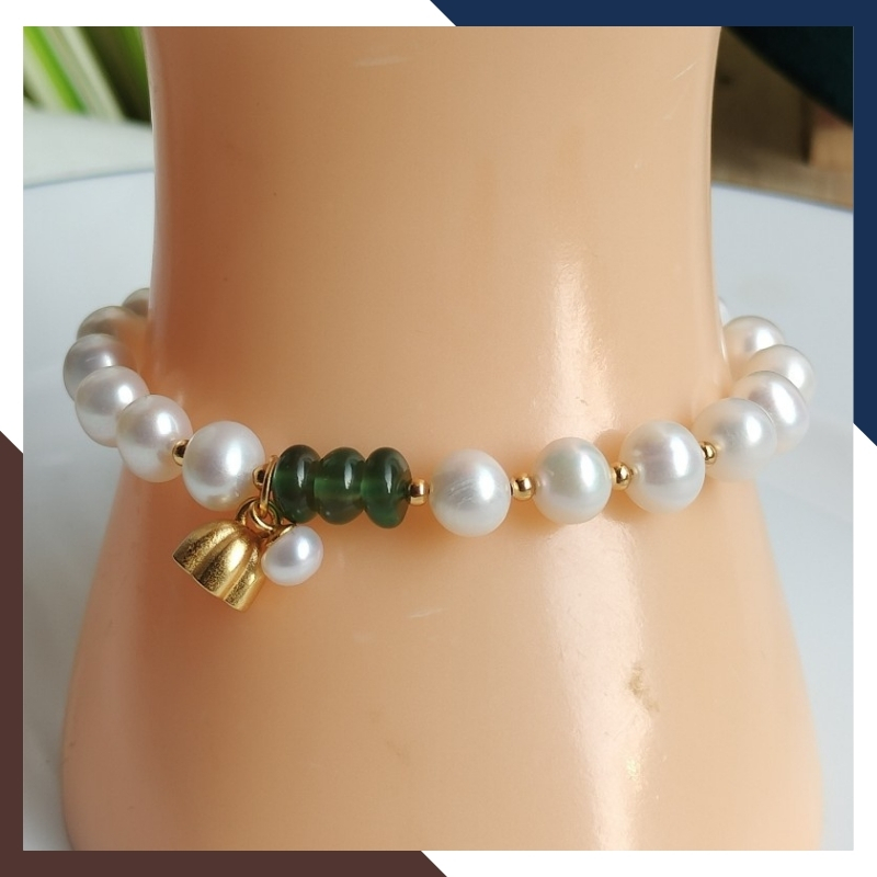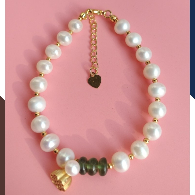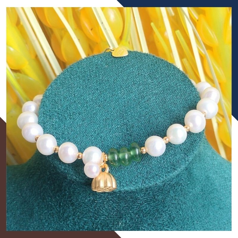 Vòng tay ngọc trai thật phối đồng điếu ngọc bích và charm đài sen bạc mạ vàng mã 78AC220, được gia công trực tiếp tại xưởng không qua khâu trung gian đảm bảo giá thành cạnh tranh