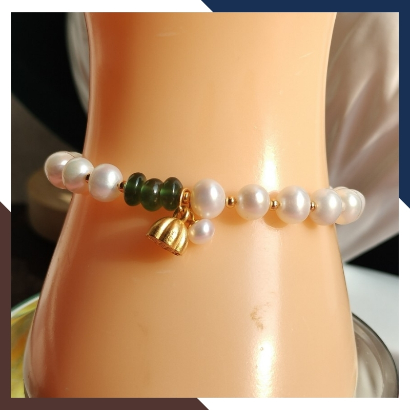 Kiểu dáng: vòng tay ngọc trai thật phối đồng điếu ngọc bích và bi 2mm, charm đài sen bạc mạ vàng