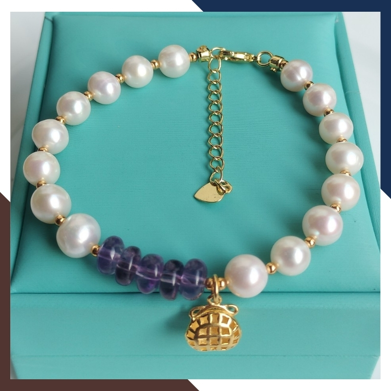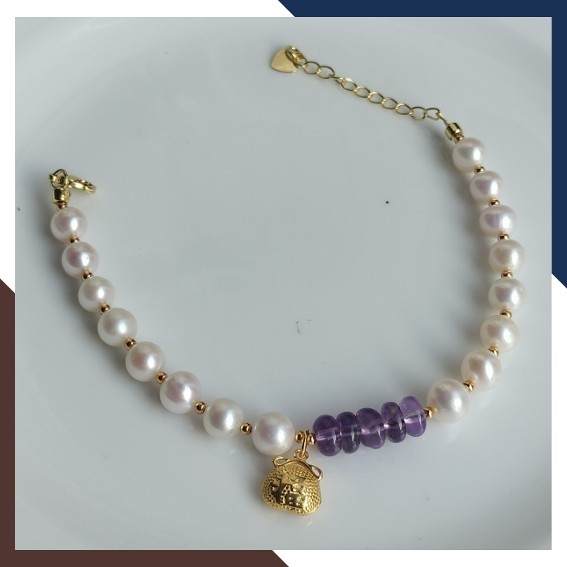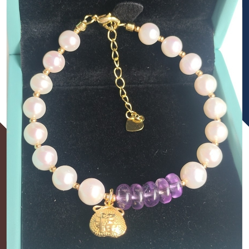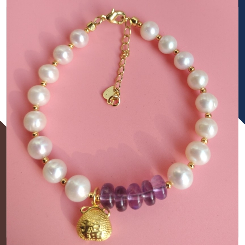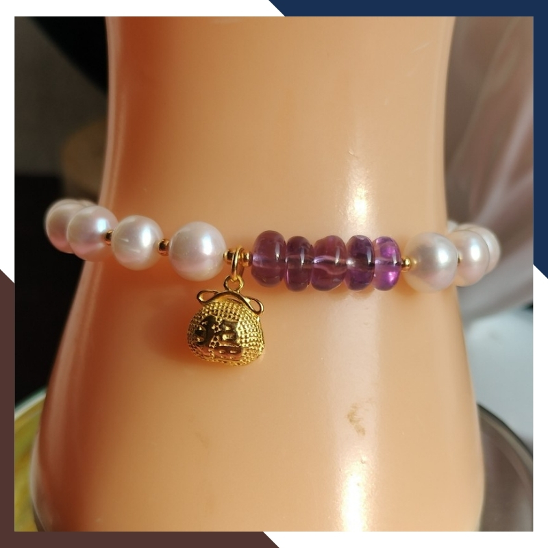 Kiểu dáng: vòng tay ngọc trai thật phối đồng điếu thạch anh tím với bi 2mm và charm túi tiền bạc mạ vàng