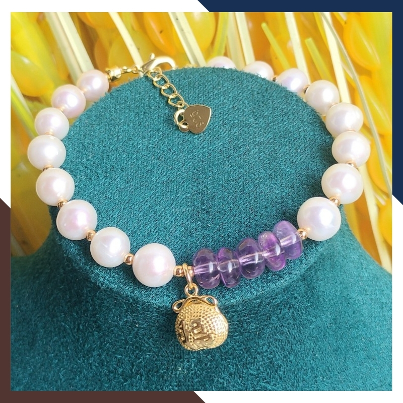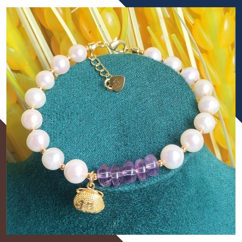 Vòng tay ngọc trai thật phối đồng điếu thạch anh tím và charm túi tiền bạc mạ vàng mã 78AC199