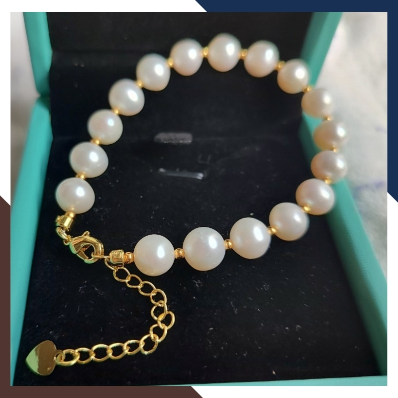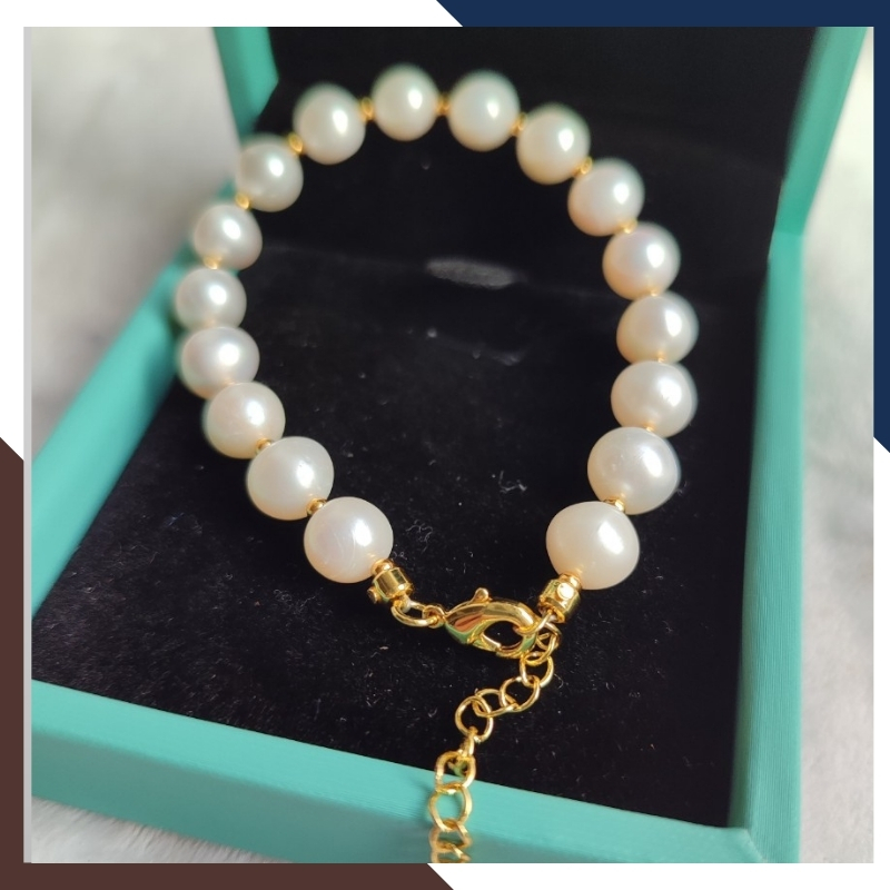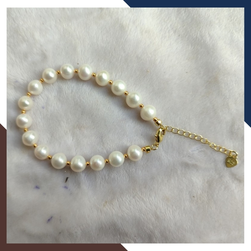Vòng tay ngọc trai thật , vòng ngọc trai đeo tay phối bi bạc mã 120AC78 - là sự kết hợp hoàn hảo giữa chất liệu, kiểu dáng và màu sắc một cách tinh tế. Điểm nhấn của mẫu vòng tay này chính là sự kết hợp màu sắc giữa màu trắng tinh khôi của ngọc trai phản chiếu ánh sáng ngũ sắc lấp lánh phối với sắc vàng của bi bạc mạ vàng, tạo ra một hiệu ứng huyền diệu mang lại vẻ đẹp mềm mại và trang nhã. Sản phẩm sử dụng ngọc trai thật nuôi nước ngọt tự nhiên, được chọn lựa tỉ mỉ đảm bảo những viên ngọc trai tương đồng về màu sắc và kích thước, có bề mặt mịn màng bóng loáng, hiếm vết sinh trưởng, cùng với bi bạc mạ vàng 3 lớp phủ nano làm tăng thêm giá trị, độ bền, vẻ sang trọng và quý phái cho sản phẩm.