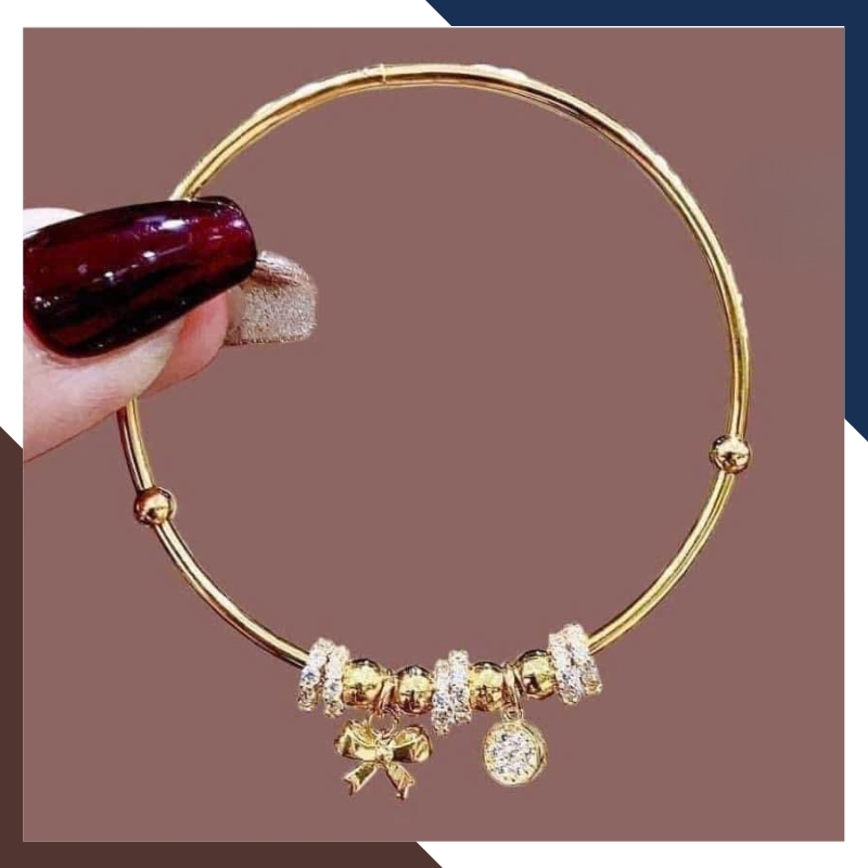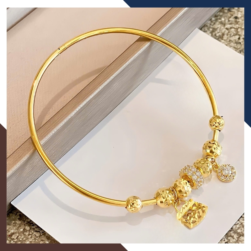 Điểm nhấn nổi bật nằm ở các charm nhỏ xinh được đính dọc thân vòng – mỗi charm là một biểu tượng mang ý nghĩa riêng, góp phần tôn lên vẻ đẹp và cá tính của người phụ nữ hiện đại.