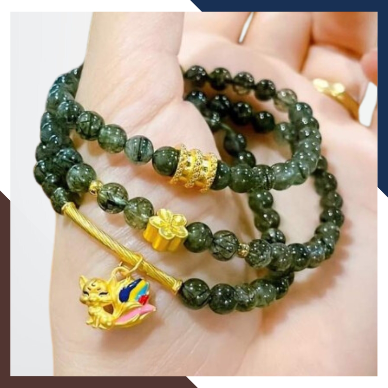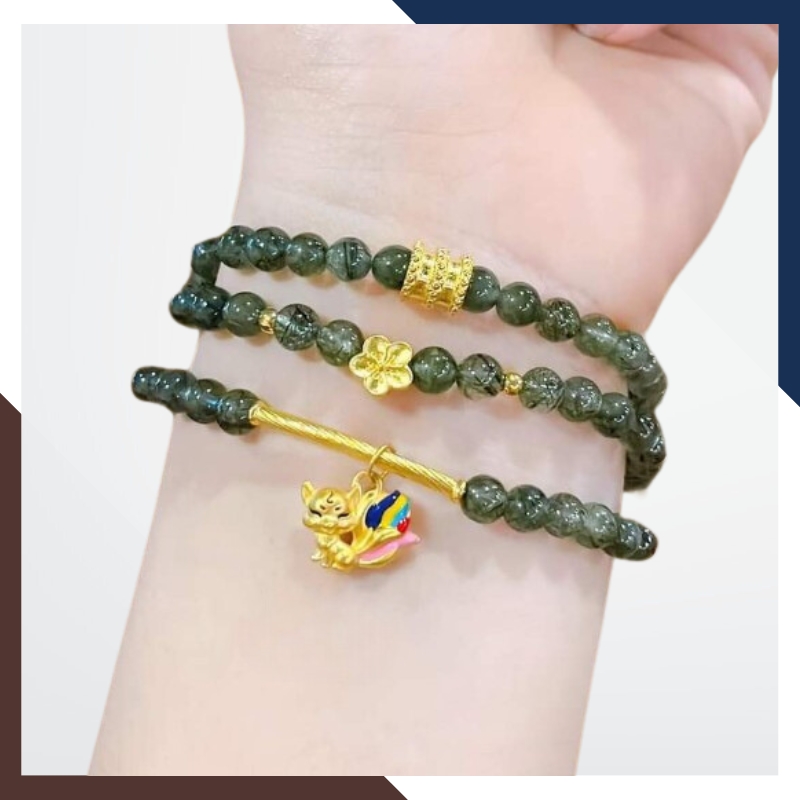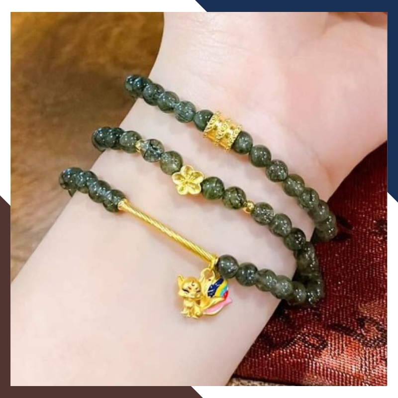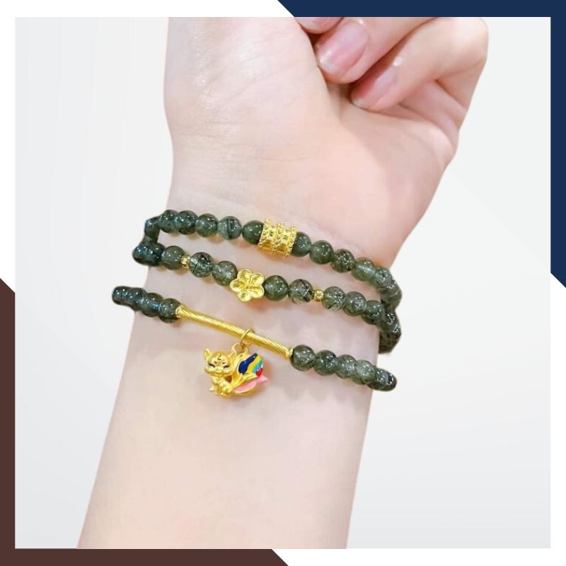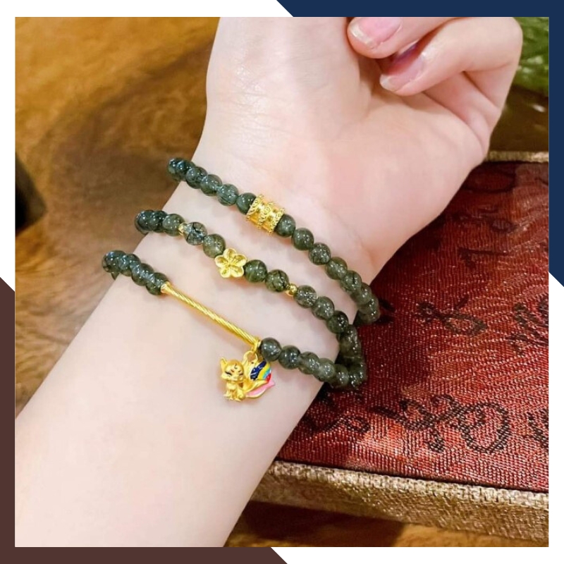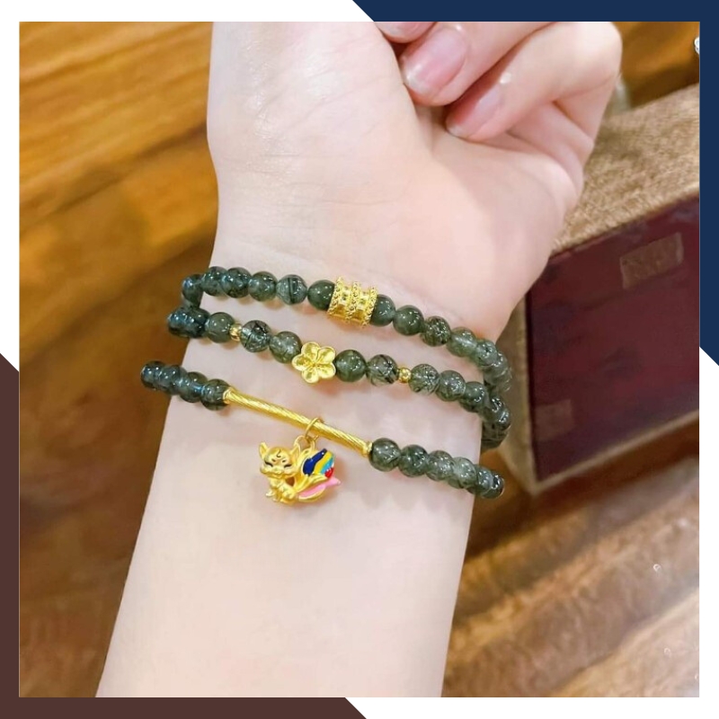 Kiểu dáng: Vòng tay đá thạch anh tóc xanh mix charm vàng 24k kiểu đeo quấn 3 vòng cho nữ mệnh Mộc